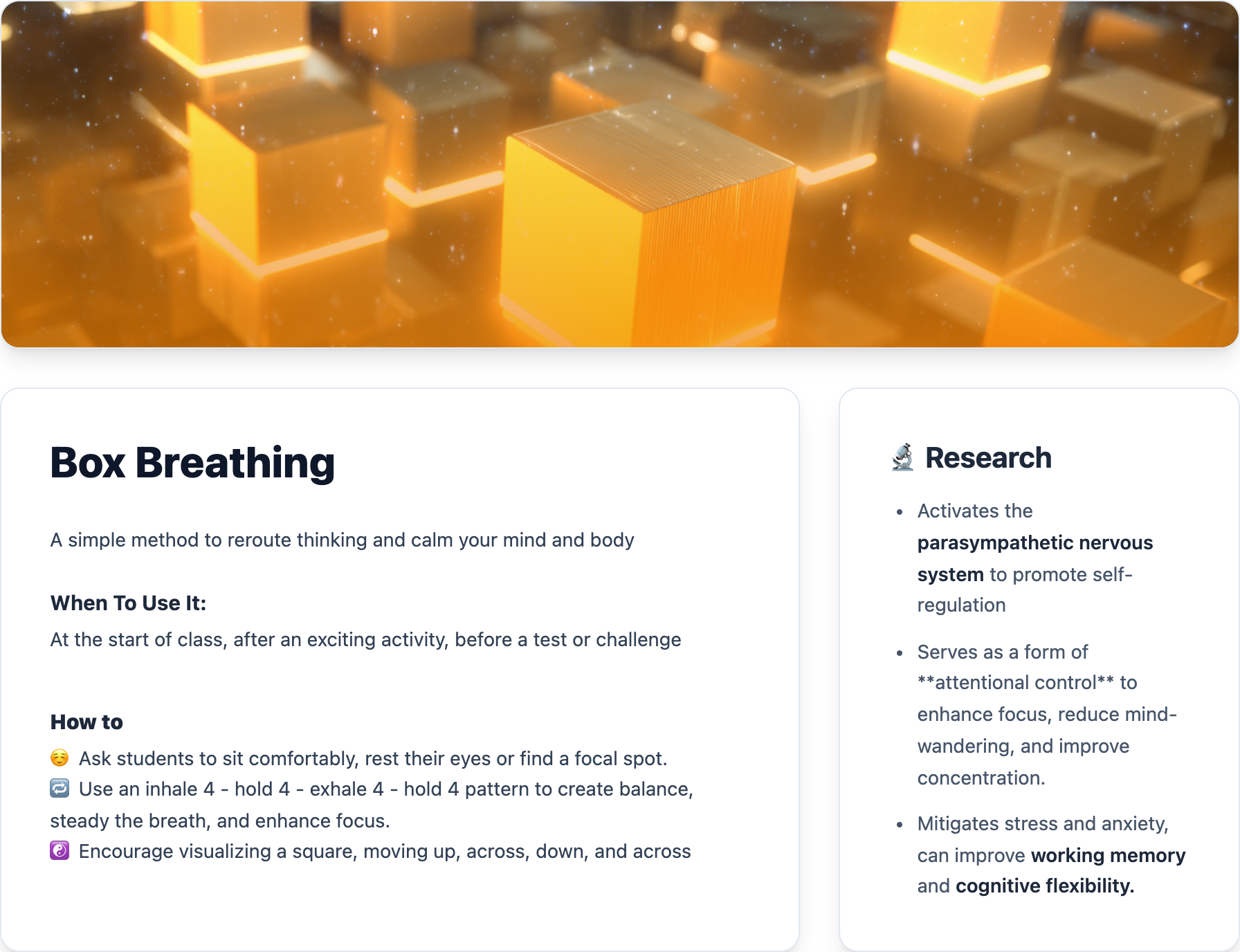 Once students get the hang of it, you can lead Box Breathing yourself or have a student volunteer guide the class. Over time, you’ll find it becomes a predictable reset everyone relies on.