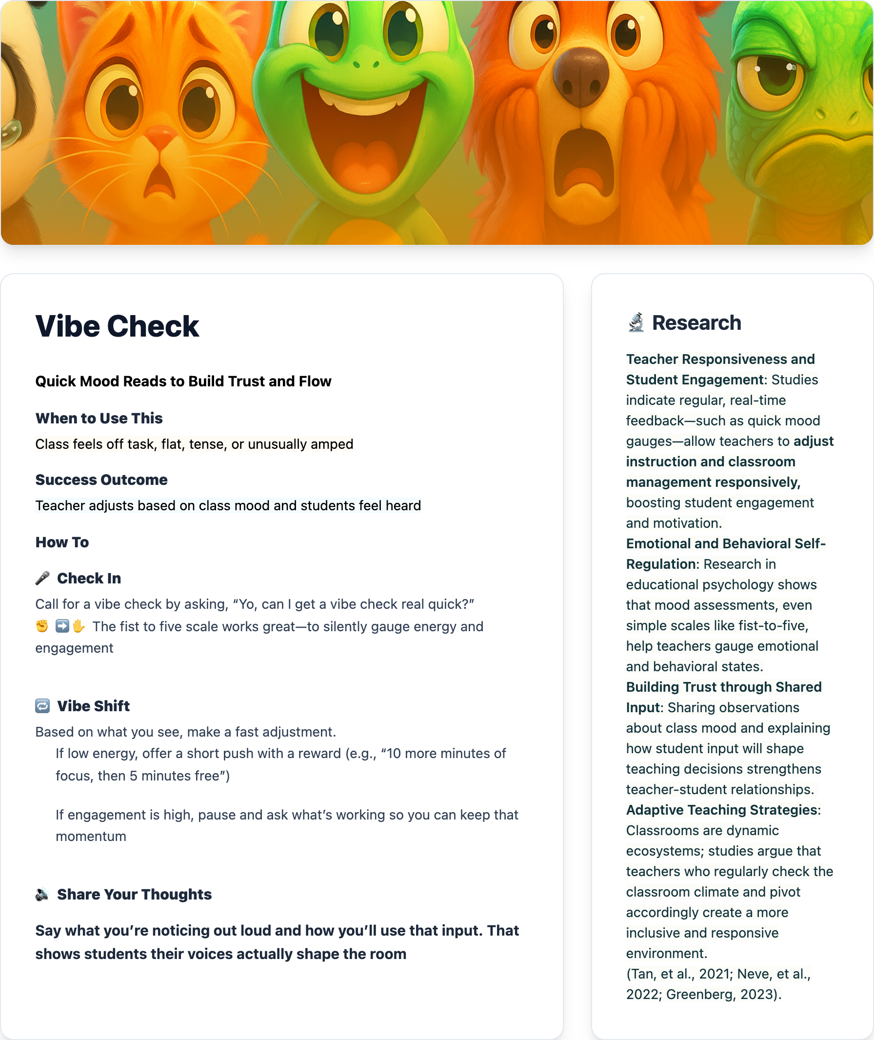 BrainZone Connection: Vibe Check activates students’ Yellow Zone (independent thinking) by prompting them to assess their personal-energy. If the energy is low, the teacher may select a Green or Orange strategy, both designed to lift activity level and connect with others. If the energy is high, a Blue or Yellow strategy will work best, providing opportunities to calm and focus the mind. Asking for real-time input builds psychological safety, models cognitive flexibility, and increases prefrontal activation, all key to motivation and attention.