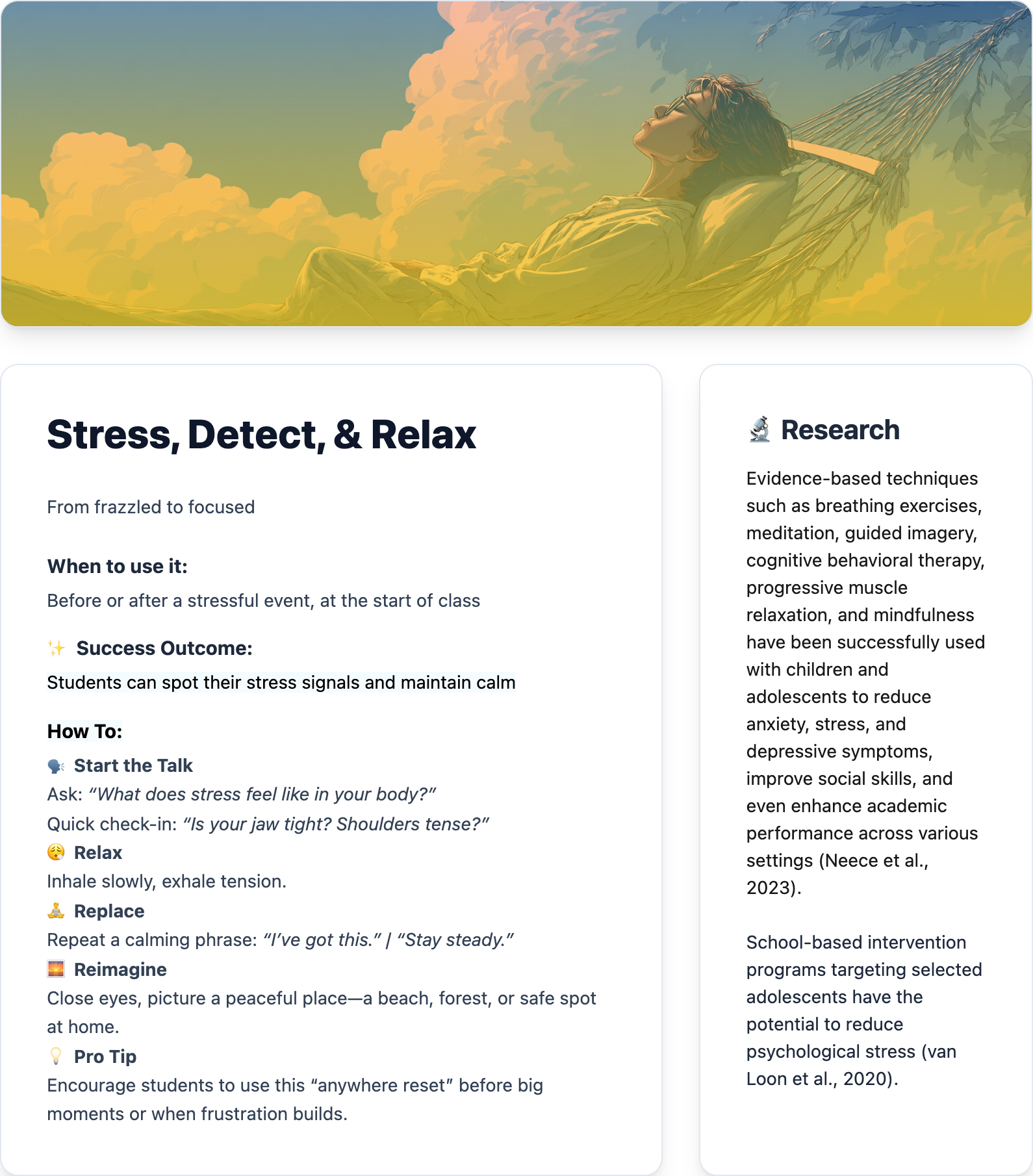 A quick reset that guides students to notice stress, release tension, and return to calm.