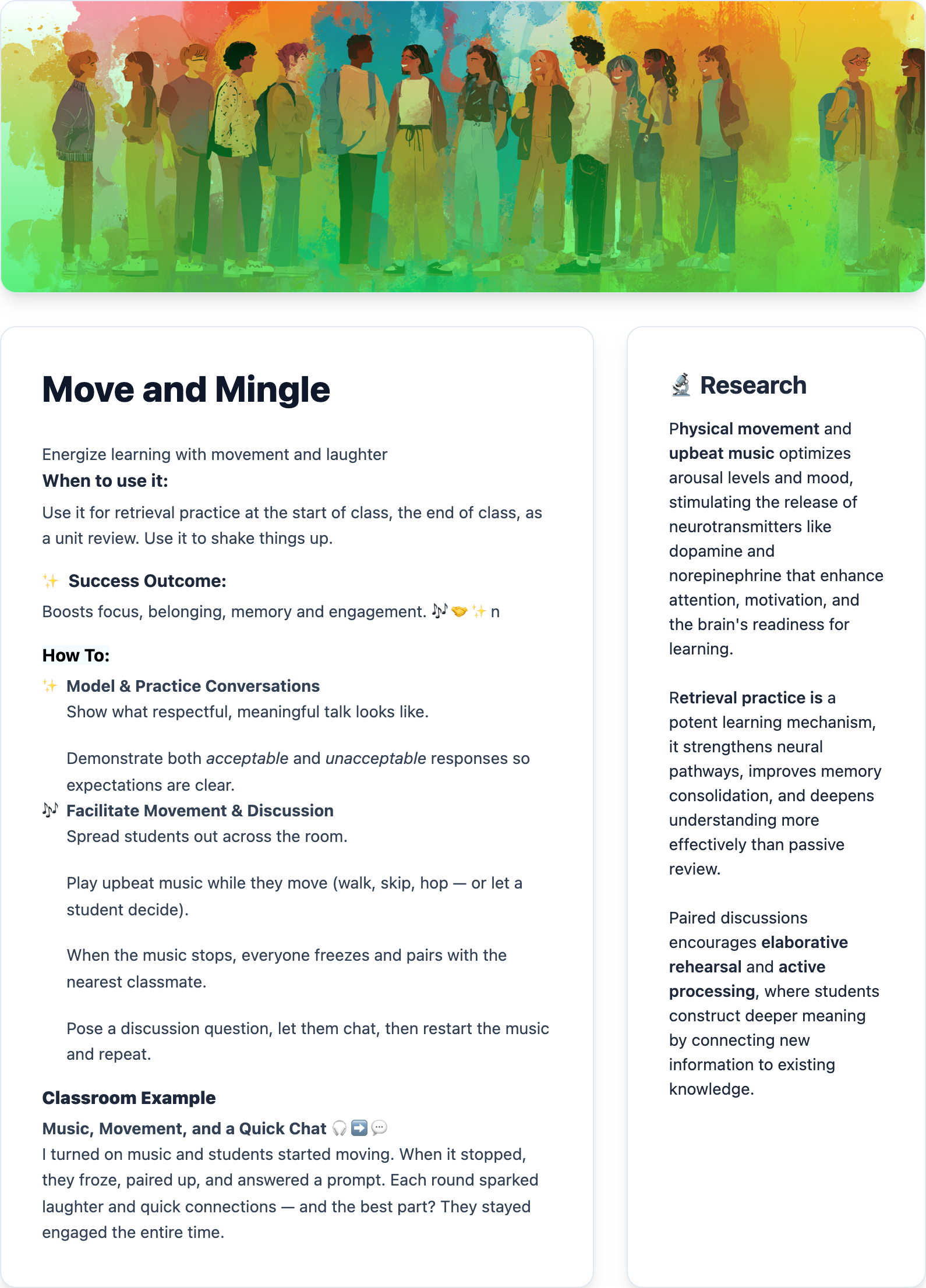 The Orange Zone works best when teachers use strategies that both fuel excitement and direct it with purpose, keeping momentum from sliding into distraction. Strategies like Press Pause and Mannequin Challenge give students a chance to release energy while staying on task. Another favorite is Move & Mingle, where music, movement, and peer discussion turn momentum into connection. You will find the full version of this strategy at the end of the article.
