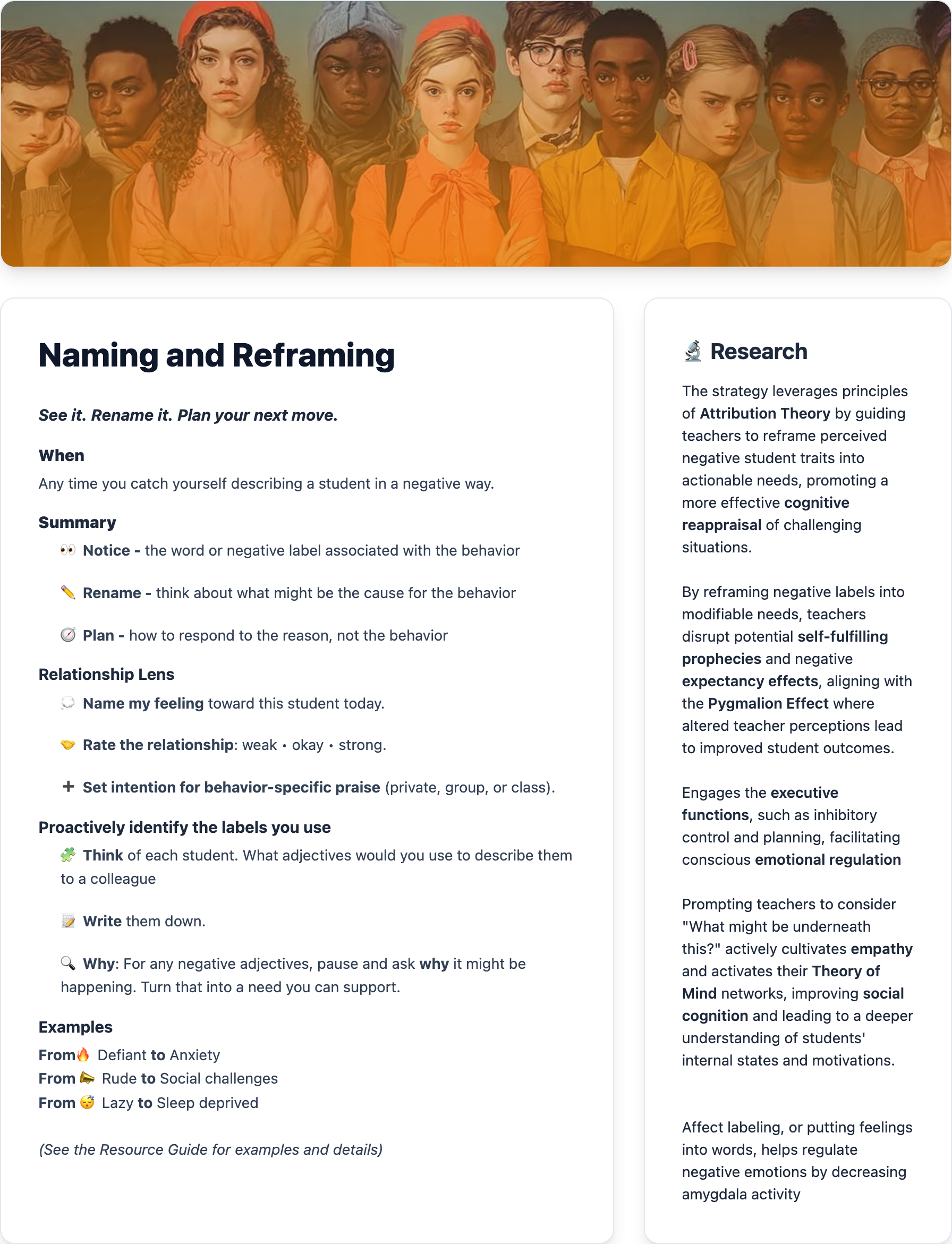 Any time you catch yourself describing a student in a negative way, the “Naming and Reframing” strategy guides you through three steps: